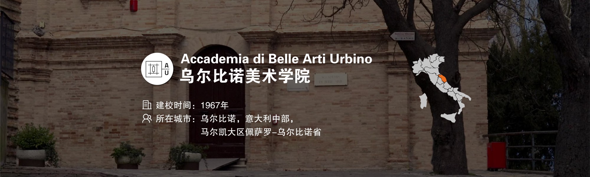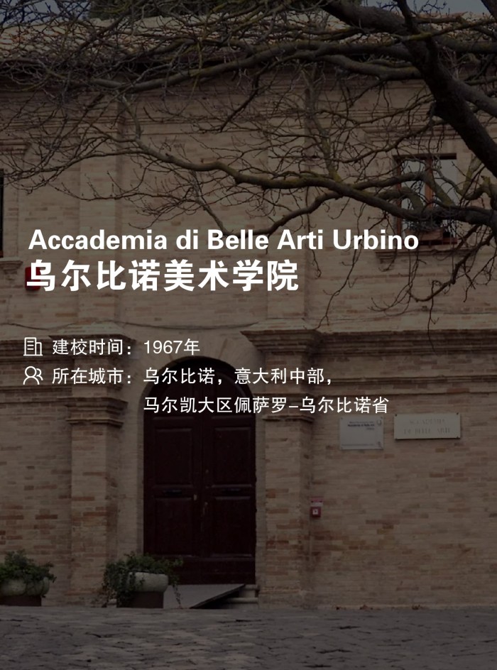 乌尔比诺美术学院(Accademia di Belle Arti di Urbino,简称乌尔比诺美院)成立于 1967 年,是意大利教育部直属管理的 25 所国立美院之一。学院位于意大利中部马尔凯大区的乌尔比诺市,这座城市是艺术巨匠拉斐尔的故乡和文艺复兴的中心城市之一,文化艺术氛围浓郁。